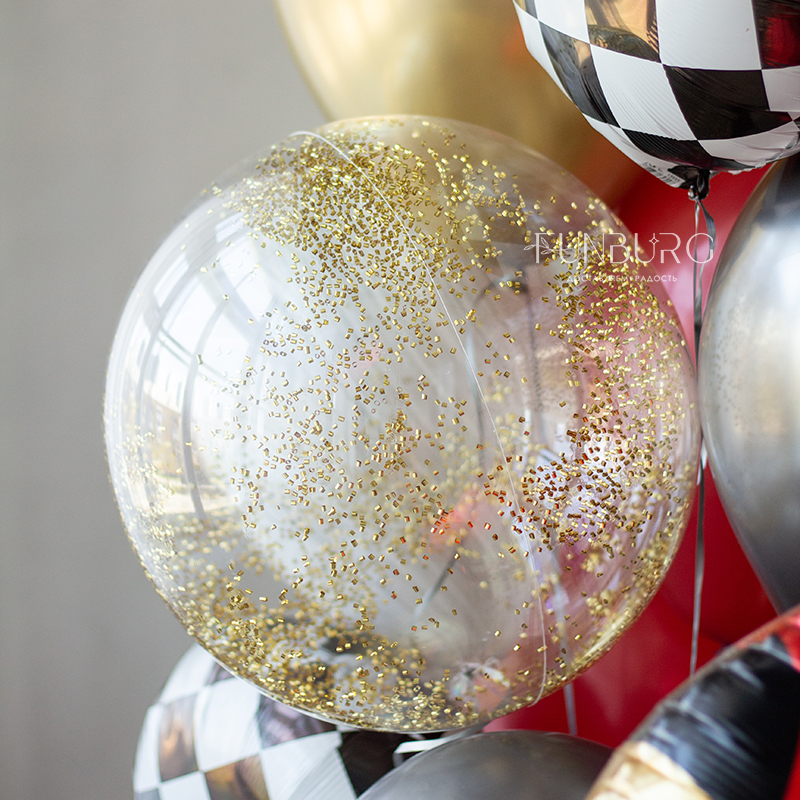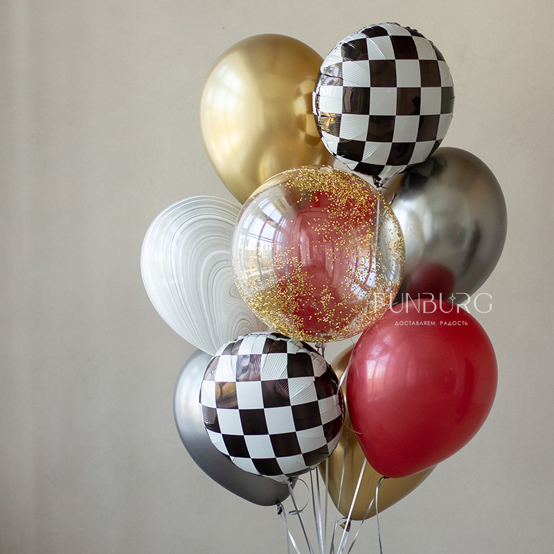 Стильная связка шариков золотых, стальных, насыщенно-красных оттенков с шаром Bubble с золотистым конфетти-цилиндрами и акцентными кругами в шахматную клетку. Связка одновременно подойдет для оформления вечеринки в стилистике Формулы 1, и для любителей шахмат, но, конечно, сама по себе, без привязки к тематике, она самодостаточна и отлично подойдет для необычного подарка и украшения праздника.