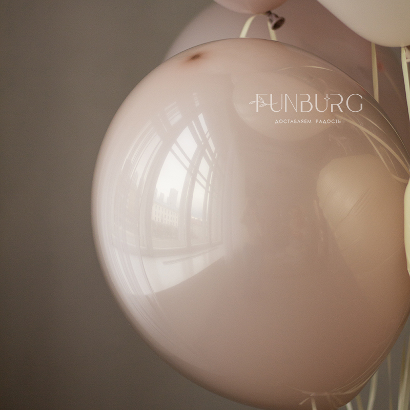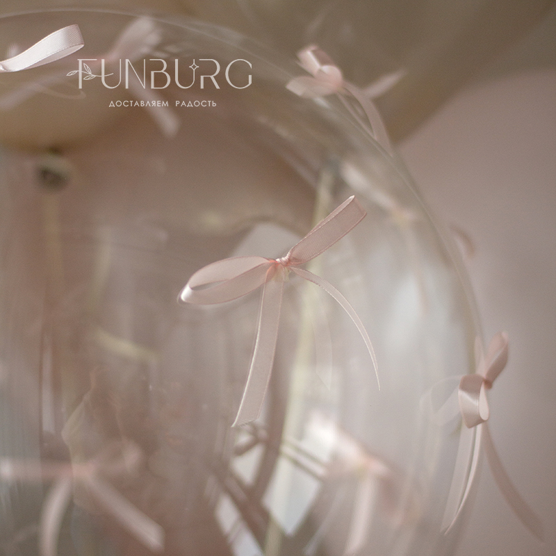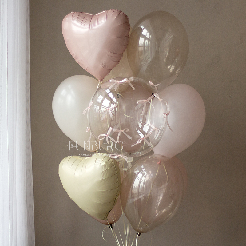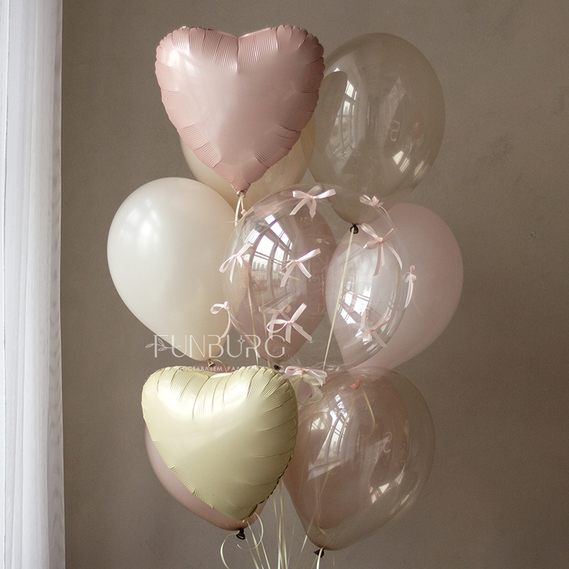 Нежнейшая связка шариков в сливочно-розовых, кремовых и прозрачно-дымчатых оттенках с шаром Bubble с бантиками и нежными сатиновыми сердечками. Для самых нежных и трогательных событий.