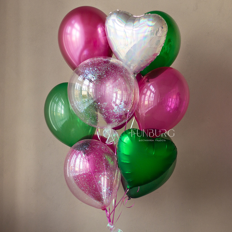 Яркая и волшебная связка шариков в бирюзовых, фиолетовых и розово-пурпурных оттенков, со сверкающими конфетти и переливающимся сердцем.