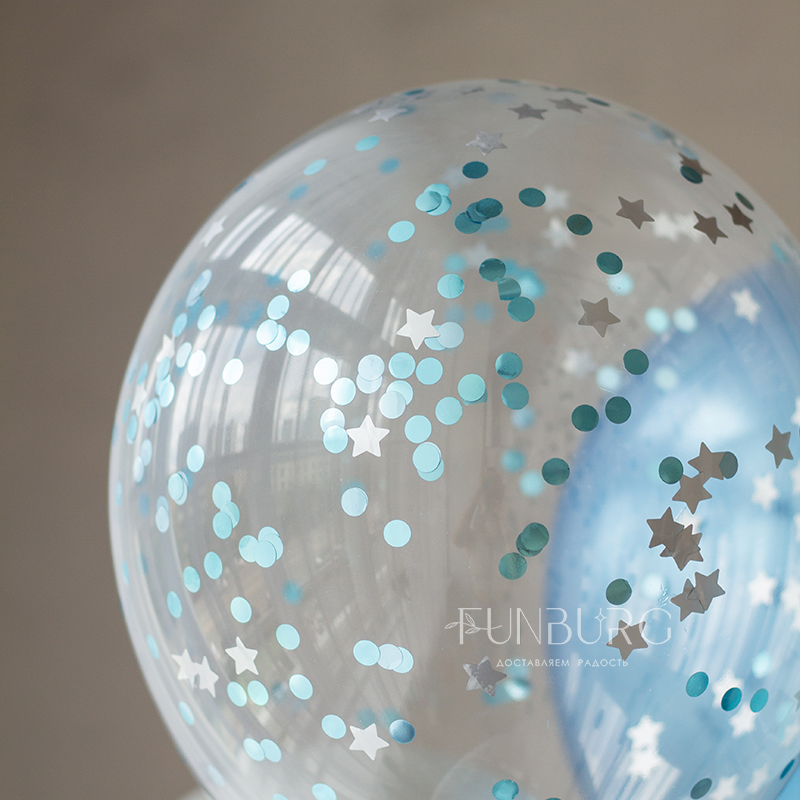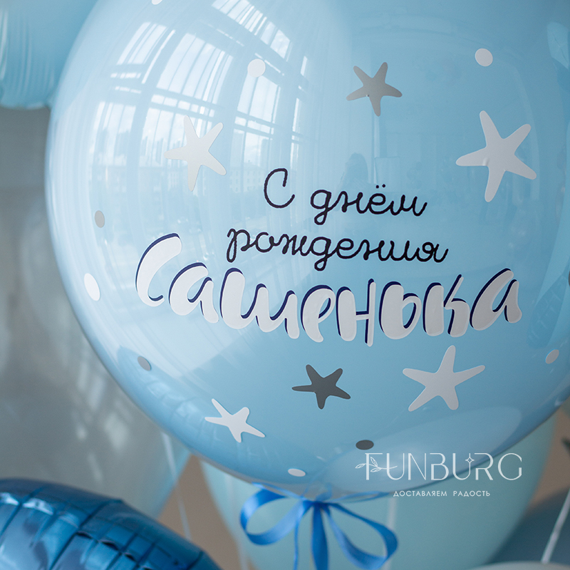 От взгляда на эту связку словно ощущаешь дуновение свежего морского бриза! В ней шарики разных оттенков голубого, синего и жемчужно-белого, красивые круги из фольги и стеклянный шар с надписью (ее можно сделать любой).