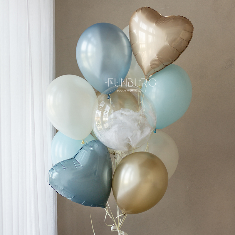 Нежнейшая связка шариков в мягких золотисто-сливочных и голубых оттенков, словно легкая туманная дымка летним утром! В ней мы собрали классические матовые и мерцающие шарики Silk, сердечки и Bubble с облачком фатина и перьев внутри. а для завершенности перевязали связку лентой. Идеально для самых нежных поздравлений.