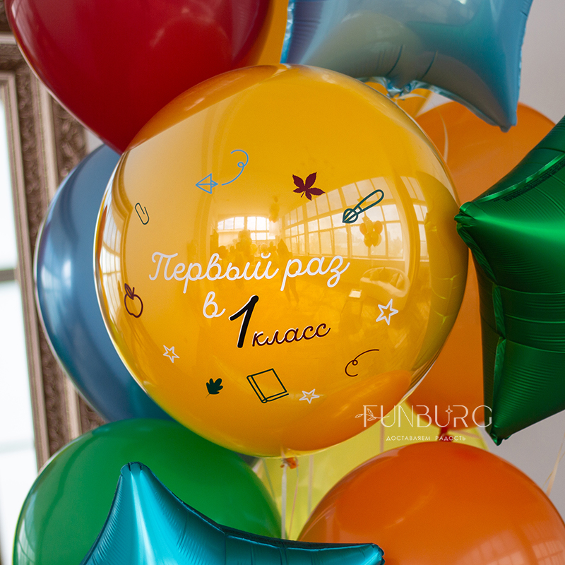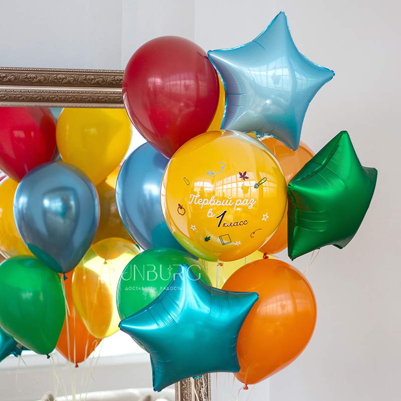 Яркая, полная красок и веселья связка шариков, с которой Первое сентября точно будет полно радости! А если изменить надпись на стеклянном шаре, связка идеально подойдет для детского дня рождения или для любителей ярких красок!