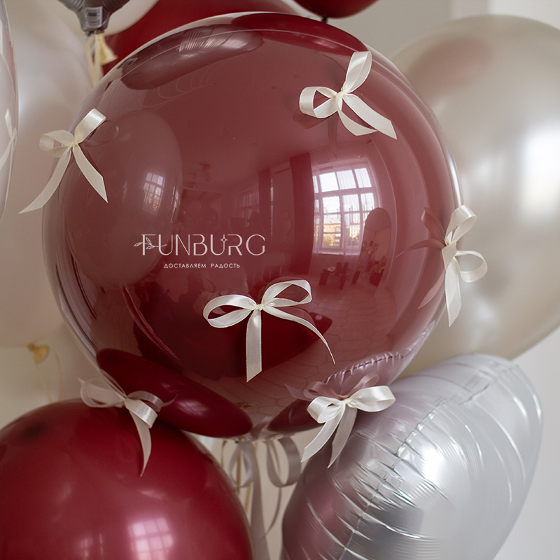 Невероятно стильная связка из шариков сливочно-белого, жемчужного и контрастного вишнёвого оттенка, с добавлением сатиновых сердец и зеркально-глянцевого стеклянного шара с молочными бантиками. Идеально для любителей изысканного и необычного.