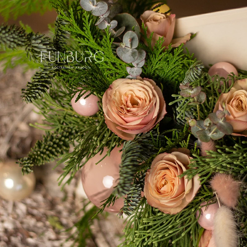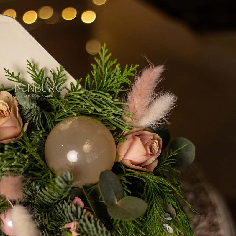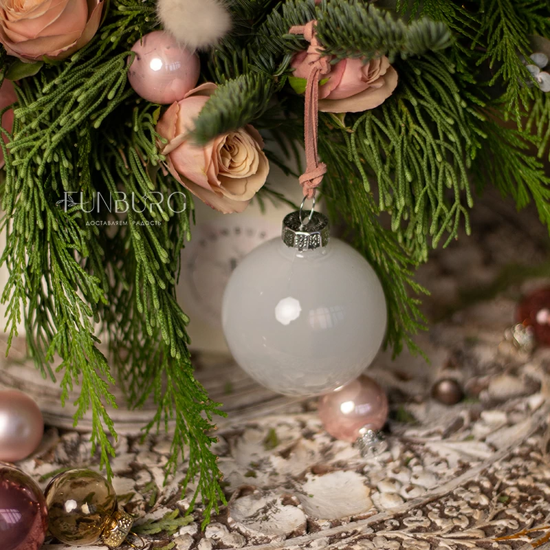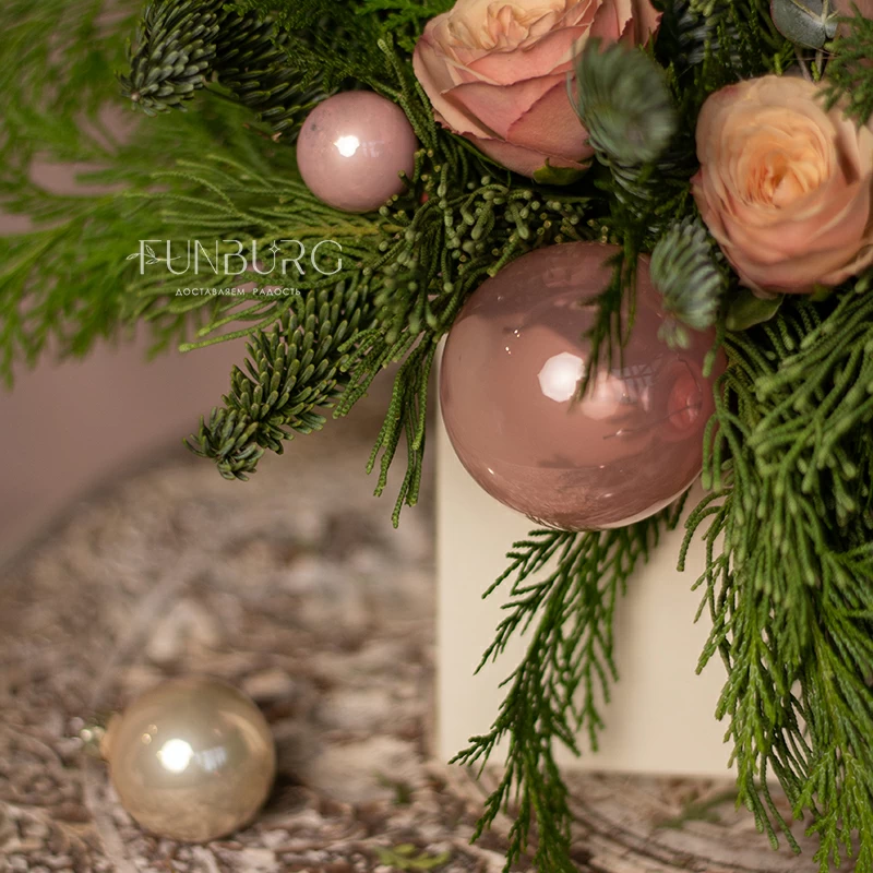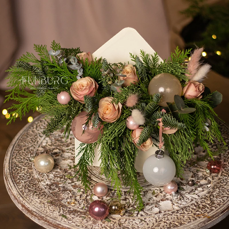 Нежнейшее зимнее послание - композиция в конверте из пушистого нобилиса раскидистой туи, пудровых кустовых роз и полупрозрачных стеклянных шариков. Идеальный зимний подарок, который одновременно порадует красотой свежих цветов и создаст новогоднее настроение.