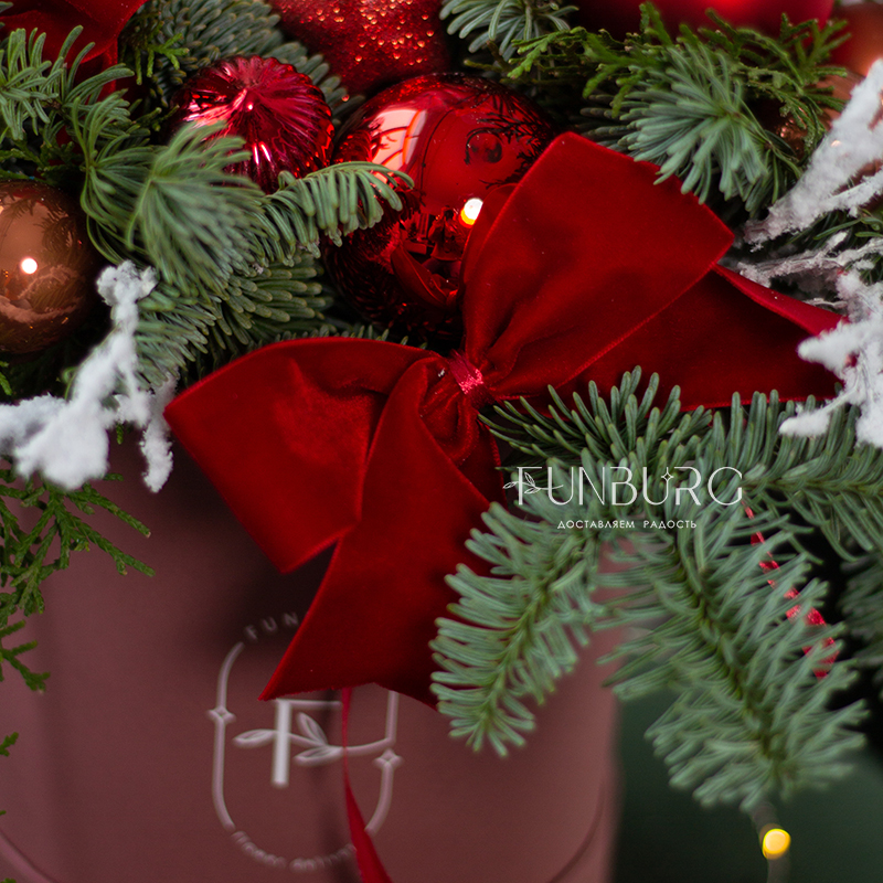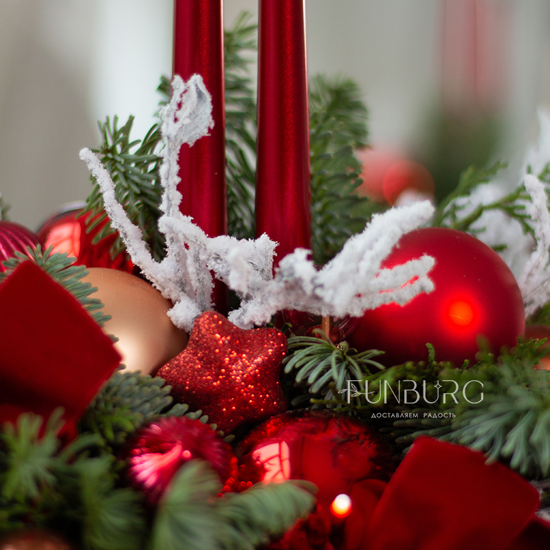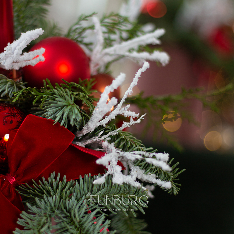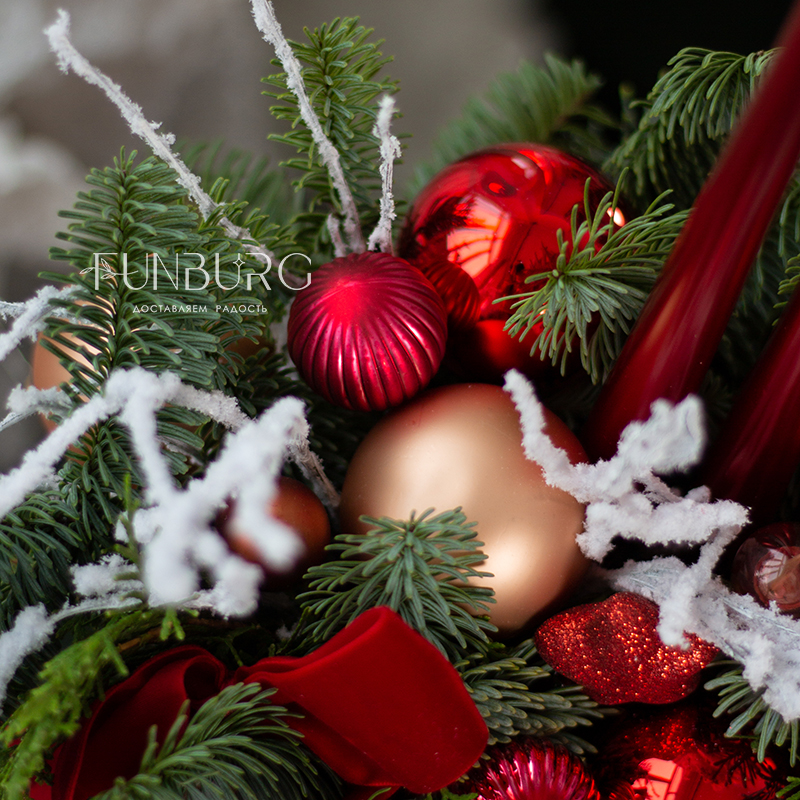 Раскидистая композиция из веточек ароматного нобилиса, пушистого кипариса и туи, с украшением из стеклянных елочных шариков в теплой и пряной клюквенно-брусничной гамме, заснеженных веточек, свечей и бархатных лент. Идеальное зимнее украшение дома, подарок на зимний праздник и даже альтернатива новогодней ёлки!