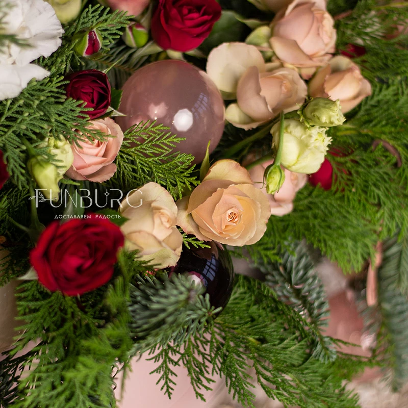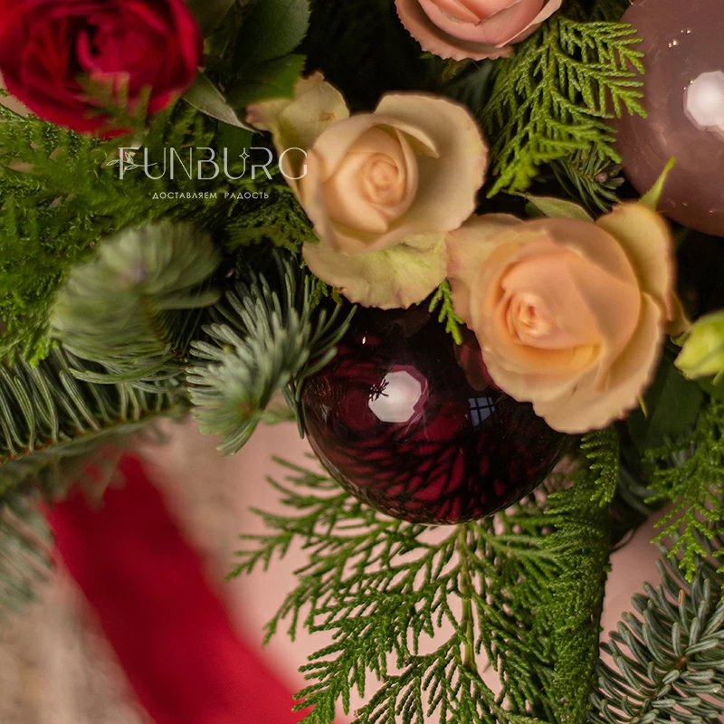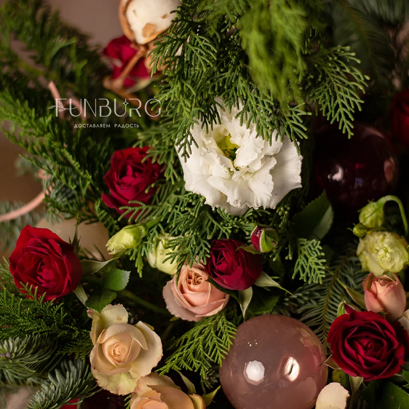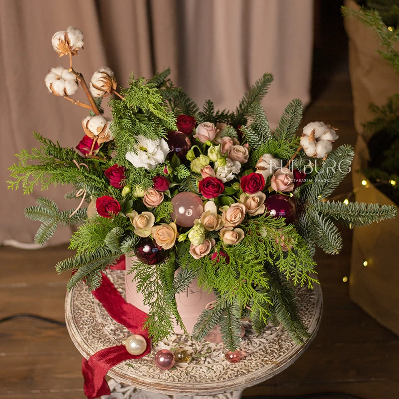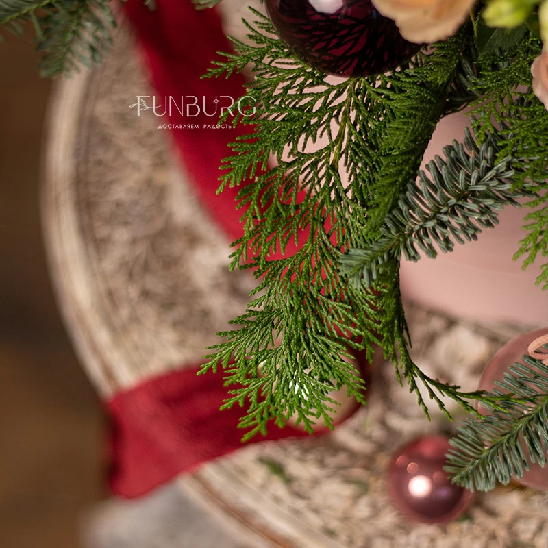 Раскидистая композиция из веточек ароматного нобилиса, пушистой туи, с пряным коктейлем из цветов винных, персиковых и белоснежных оттенков, дополненных мягким хлопком и красивыми стеклянными елочными шариками. Идеальный цветчный подарок на любой зимний праздник!