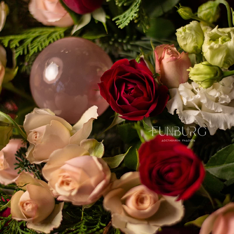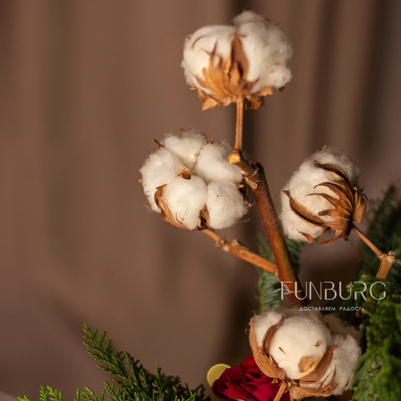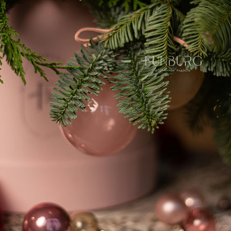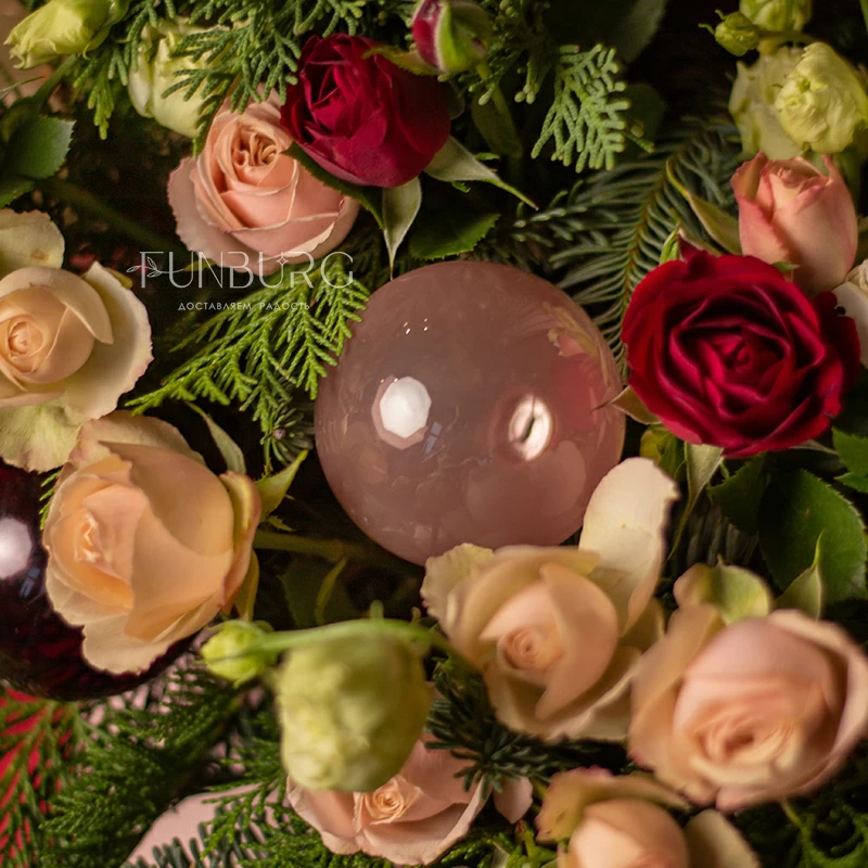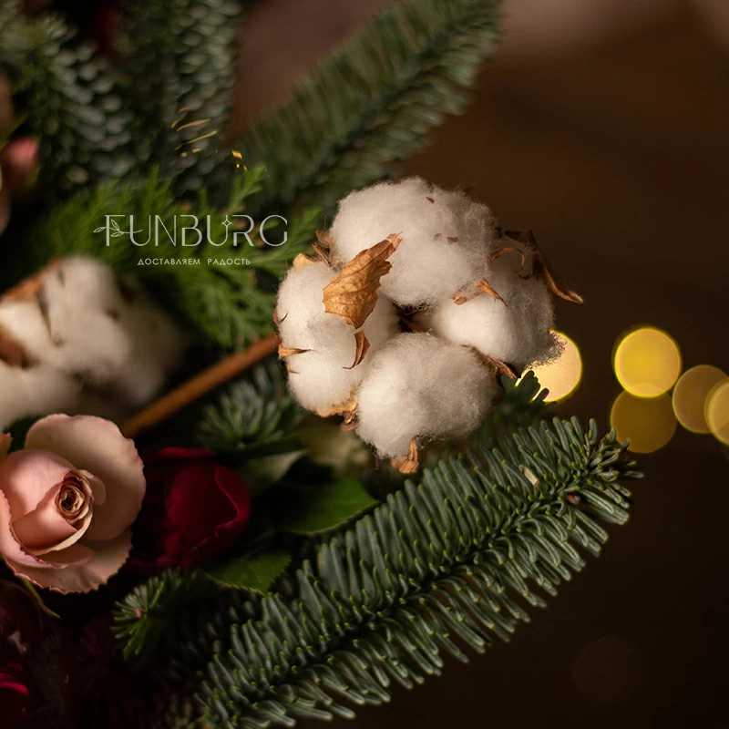Раскидистая композиция из веточек ароматного нобилиса, пушистой туи, с пряным коктейлем из цветов винных, персиковых и белоснежных оттенков, дополненных мягким хлопком и красивыми стеклянными елочными шариками. Идеальный цветчный подарок на любой зимний праздник!