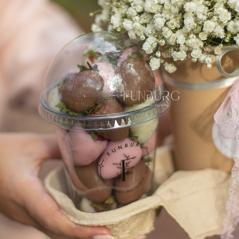 - клубника в шоколаде в стаканчике, 280-300 г (молочный и белый шоколад)