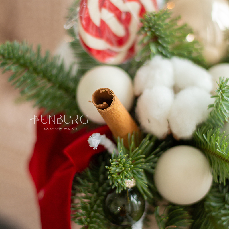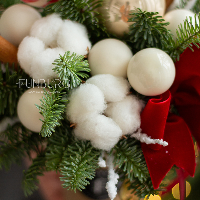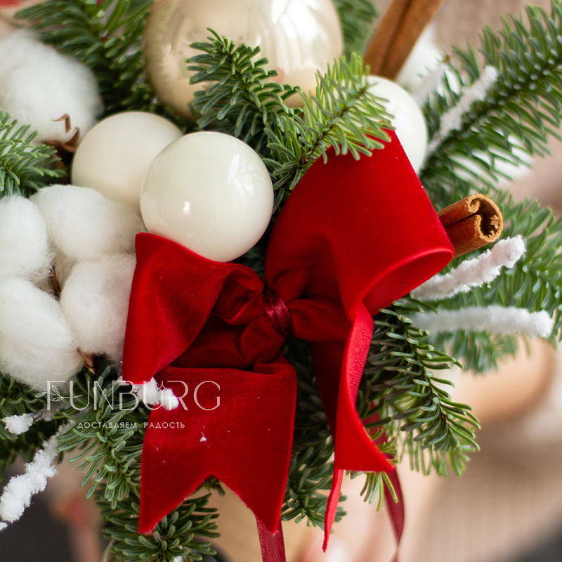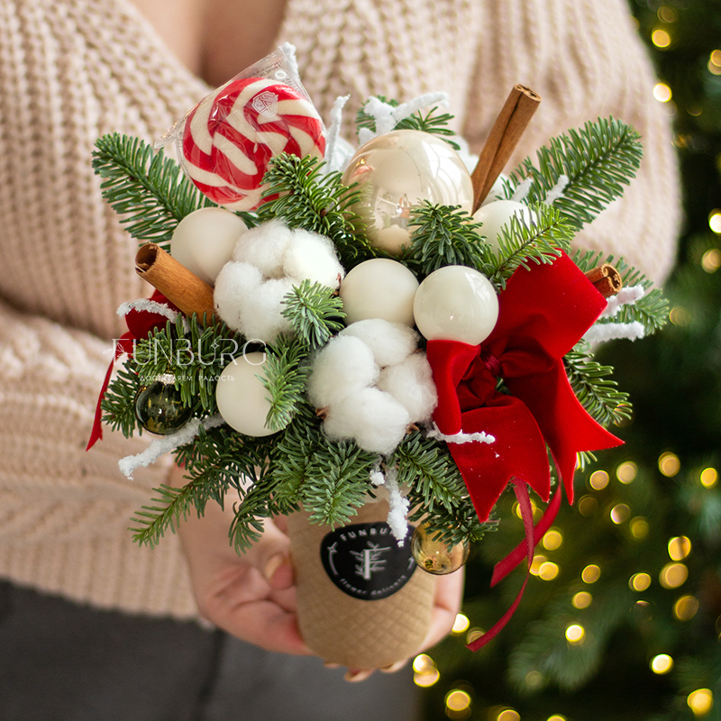 Сезонный зимний стаканчик,, похожий на согревающий нежный сливочный раф с леденцами! В этом еловом «напитке» веточки ароматной пушистой ели украшены сверкающими стеклянными шариками нежных сливочно-розовых оттенков, натуральным хлопком, веточками лагуруса и невесомыми перышками. Такую композицию так приятно подарить близким зимой просто так, даже без всякого повода.